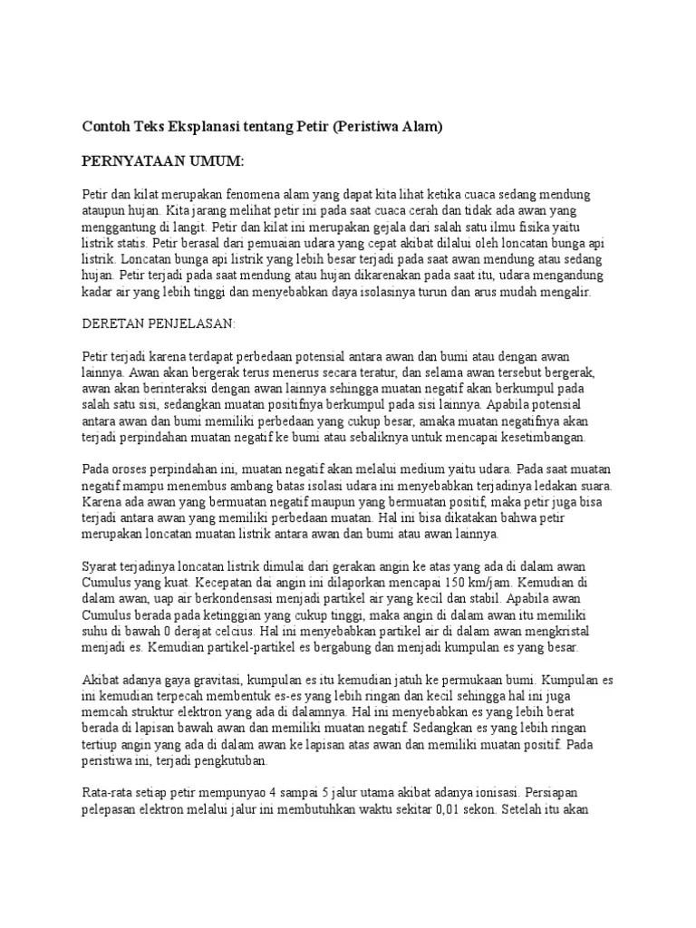 Petir merupakan sebuah fenomena alam yang sulit dicegah. Contoh teks eksplanasi tetntang fenomena alam salju petir dan tsunami. Petir, kilat, atau halilintar merupakan fenomena alam yang umumnya terjadi pada saat musim hujan dan diawali dengan kilatan cahaya. Petir tidak termasuk bencana alam, namun tetap harus waspada ketika terjadi badai petir. (1) petir yang mempunyai sebutan lain kilat atau halilintar merupakan fenomena alam yang umumnya terjadi pada saat musim . Contoh teks eksplanasi fenomena alam. Fenomena ini sering terjadi pada musim hujan disaat langit memunculkan kilatan cahaya sesaat. Petir atau yang biasa disebut kilat dan halilintar merupakan fenomena alam yang umumnya terjadi pada saat musim penghujan. Petir adalah suatu fenomena alam yang terjadi karena adanya perbedaan potensial atau muatan yang ada pada awan dan bumi atau dengan awan yang . Semuacontoh, yoo, para, pembaca, kali, ini, saya, akan, membagikan, contoh, singkat, teks, eksplanasi, tentang, fenomena, alam, petir, . Petir merupakan sesuatu yang biasanya muncul pada musim hujan. Petir merupakan fenomena alam yang terjadi akibat loncatan ataupelepasan muatan listrik karena adanya beda potensial antara awan danbumi. Petir, kilat, atau halilintar adalah gejala alam yang biasanya muncul pada musim hujan saat langit memunculkan kilatan cahaya sesaat yang .